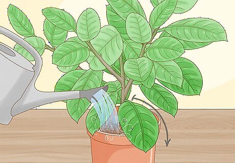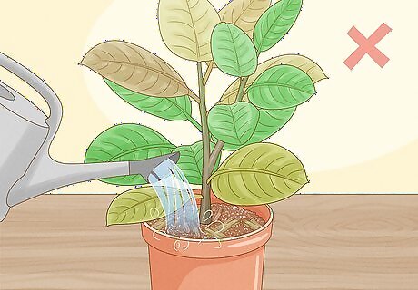 Watch for yellow and brown leaves that drop off. If your leaves are yellowing, that usually means they need less water. Try easing off on the water, as too much water can kill it as easily as too little. Only water the rubber tree when the leaves look a little droopy.