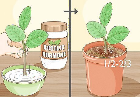 Plant the stem cutting in rooting medium. Add rooting medium like perlite to a small pot. Plant the stem 1/2-2/3 of the way into a hole with all the leaves above the soil. Water it until it's moist and cover it with clear plastic. Once the roots have reached 1 to 2 inches (2.5 to 5.1 cm), you can move it to regular potting soil and a bigger pot.