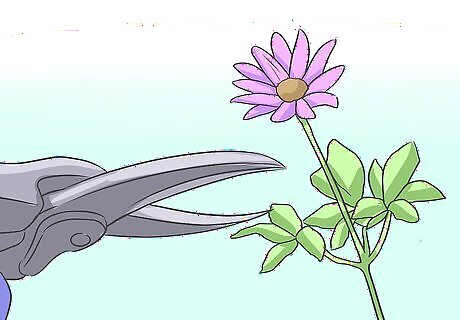 Prune twice a year. You'll need to do some light pruning in the spring and some heavy pruning in the fall. Pinch young shoots in the spring to redirect growth outward. Doing so will create a bushier plant. Cut the entire aster plant back once the foliage dies in the winter. Cut down stem portions that appear sickly or scraggly, or trim the stems back completely to 1 or 2 inches (2.5 or 5 cm) above the soil line. Most aster varieties can withstand either option. Cutting the plant down can improve its long-term growth habit, but doing so will also delay flowering by several weeks. If you live in a colder climate (USDA hardiness zones 5 and below), you may want to wait until spring before doing major pruning. Leaving the plants intact over harsh winters can improve their odds of survival. You can also remove dead flower blooms on an ongoing basis to improve the overall appearance of the plant, but doing so is not necessary for the health of the plant. If you do deadhead old blooms, do so carefully since new buds tend to be located nearby.