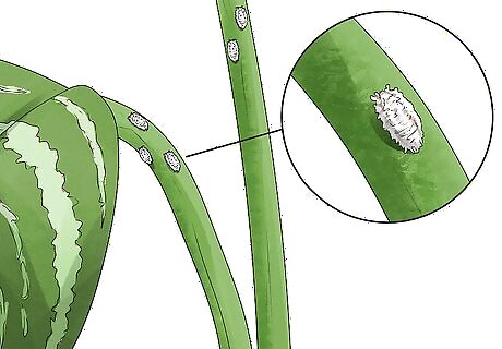 Watch for white wholly mealy bugs. These look like white fuzzy versions of pill bugs.These critters come around when plants are exposed to overly hot and dry conditions. They can be found mainly where the stem meets the leaf or the underside of leaves. Use a pesticide that is safe for plants to combat them.
