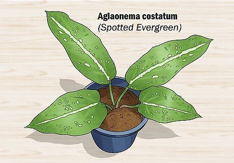 Identify Spotted Evergreen (Aglaonema costatum) by looking for dark green starry dotted leaves. These are the most compact of all Chinese Evergreens, rarely reaching over 2 feet tall.