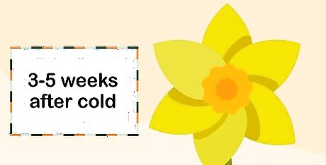 Wait for your daffodils to bloom. It typically will take 3 to 5 weeks after the cold treatment before flowers appear, but it will vary based on the variety. Once the plants bloom, the flowers will last for approximately 1 month Move the daffodils out of direct sunlight once they've bloomed to prolong the life of the flowers.