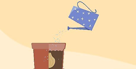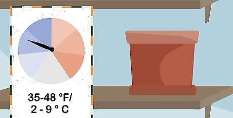 Place pot in cold storage. The cold treatment will mimic the conditions the bulbs would experience if you had planted them outdoors. Temperatures from 35 to 48 degrees F (1.7 to 8.9 degrees C) are ideal. The bulbs will not grow properly if it is either too cold or too hot. Cover the soil in the pot with a loose layer of leaves or sawdust to help regulate the temperature. Pick a location that is dark and cool. Good options include sheds, garages or refrigerators. In climates where it does not freeze outside, you can dig a hole and bury the plant outside. Keep soil moist, but don't overwater.