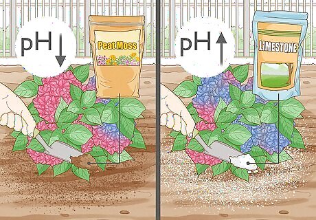 Change the color of hydrangeas. The color of hydrangeas depends on the pH of the soil in which they are planted. If you have pink or blue hydrangeas, it's possible to change their color by changing the soil's pH. This can take weeks or months, so be patient! Wait until your plant has been in the garden at least two years before attempting color change. To change flowers from pink to blue, lower the soil's pH by adding sulfur or peat moss. To change flowers from blue to pink (which is more difficult than changing from pink to blue), add limestone to the soil to raise the soil's pH. White hydrangea blossoms don't change color. Gently mix in soil amendments into the first few inches of soil around your plant’s roots.