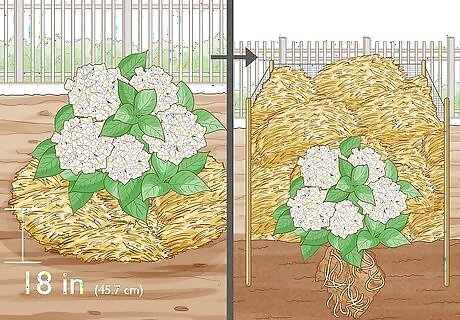 Protect hydrangeas over the winter. Cover them with mulch, straw, or pine needles to a depth of at least 18 inches (45.7 cm). If you have smaller bushes, you can cover the entire plant for the winter. Remove the cover in early spring, after the last frost. Use chicken wire or some other small fence like cage to help mulch stay around plant’s crown.