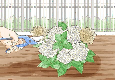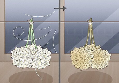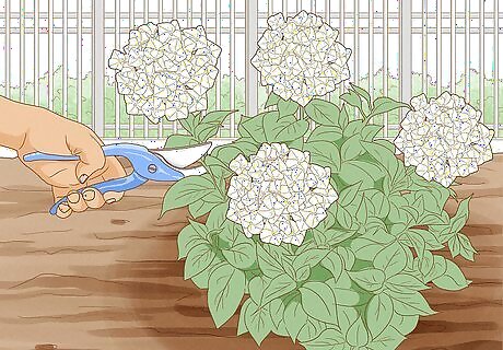 Harvest hydrangeas when the flowers are mature. Wait until the color is rich and the flowers have a papery, rather than juicy, consistency. This will make the flowers easier to dry. Use a scissors or pruning tool to cut the stems.