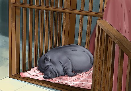 Prepare a comfortable indoor spot for your potbellied pig to sleep. If you don’t want your new potbellied pig to sleep in bed with you, you’ll need to make it a bed of its own. You can use a dog bed or soft pillows and blankets to make your pig’s sleeping area with. Just make sure your pig will be comfortable. You can also set up your pig’s bed in a large dog crate. Make sure the crate is big enough for your pig to stand up and move around in.