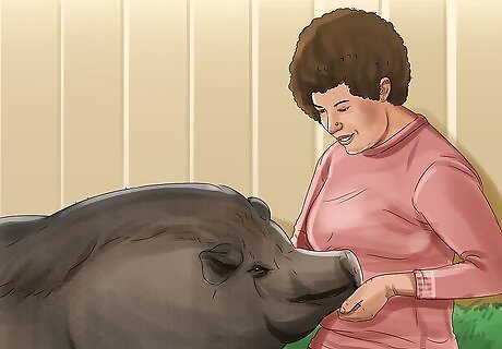 Give your pig plenty of attention every day. Potbellied pigs are intelligent animals that get bored and frustrated easily. To prevent this, make sure you’re spending time with your pig every day. If your pig seems irritated or depressed, it could be a sign that it’s not getting enough attention. Make it a point to give your pig a nice, long belly rub every day. Spend time each day training your pig and rewarding it with treats. Take your pig for walks or sit in your yard with it when it’s playing outside.