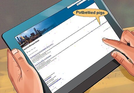 Check if your city allows potbellied pigs as pets before you get one. Every city has different zoning codes, and some don’t allow farm animals to be kept as pets. Before you adopt a potbellied pig, you’ll want to make sure it’s legal in your area. Visit your city government's website to find out the laws regarding potbellied pigs in your area.