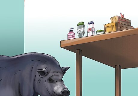 Move dangerous household products somewhere your pig can’t reach them. Cleaning products, medicines, cosmetics, toiletries, and other common household products aren’t safe for potbellied pigs. Since pigs are naturally curious animals, you’ll want to keep these items up high so your pig doesn’t get into them. Avoid leaving dangerous household products on low surfaces, like coffee tables, nightstands, and the floor. Potbellied pigs can grow to be 26 inches (66 cm) tall, so make sure you're putting dangerous household products up high enough so your pig can't reach them.