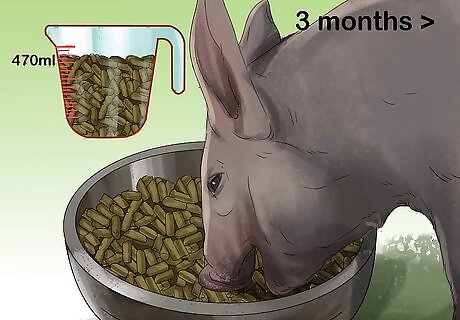 Give your pig 2 cups (470 mL) of food per day if it’s older than 3 months. Once your pig is 3 months old, you can start feeding it larger portions of pellet food. Gradually increase the amount of food you’re giving your pig from ⁄4 cup (180 mL) to 1 cup (240 mL) so it has time to adjust. Split up your pig’s daily serving of food so you’re feeding it once in the morning and once in the evening.