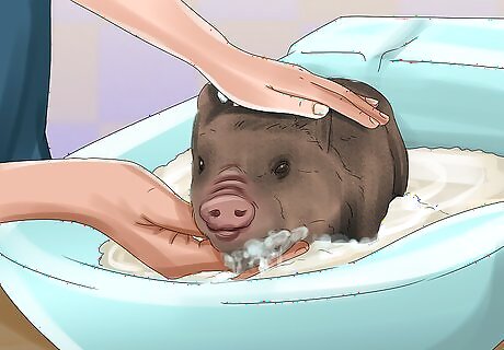 Give your pig a bath whenever it’s dirty. Contrary to popular belief, potbellied pigs are naturally clean animals, and it’s not necessary to bathe them regularly. However, if your pig gets dirty playing outside, you can rinse it off inside a large shower or in a swimming pool outside. Avoid bathing your pig more than necessary. Excessive bathing can dry out your pig’s skin and cause irritation.