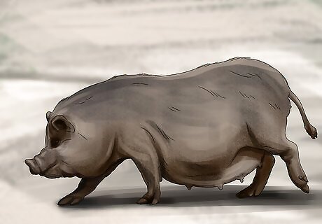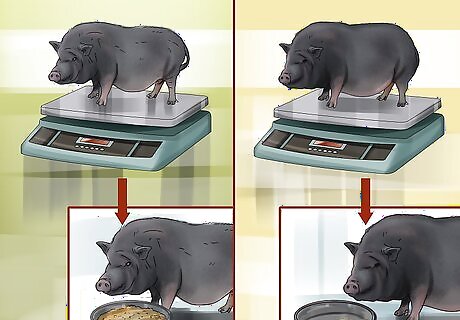 Give your pig less food if it starts to gain a lot of weight. Obesity is a major health concern for potbellied pigs. Obesity can lead to other health issues, like respiratory problems and arthritis. If you notice your pig gaining a lot of weight, adjust its diet as needed. The average healthy weight for potbellied pigs is 120–150 pounds (54–68 kg). However, some potbellied pigs can weigh up to 250 pounds (110 kg) and not be considered obese, depending on their size. If you think your pig might be obese but you’re not sure, take it to the vet for an expert opinion. Your vet will also be able to give you specific dietary recommendations to help your pig lose weight.