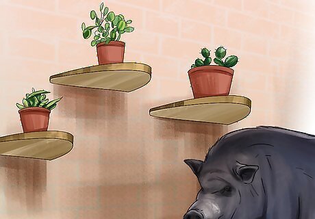 Find new spots for any household plants that are on low surfaces. There are a variety of household plants that are toxic to potbellied pigs. Even if your plants aren’t toxic, you’ll still want to move them so your pig doesn’t chew on them or knock them over. Keep your plants on high surfaces, like countertops, your dining room table, or high up on a bookshelf.