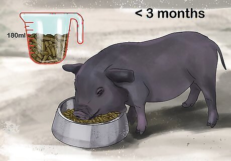 Feed your pig ⁄4 cup (180 mL) of food per day if it’s under 3 months old. When your pig is still a young piglet, you’ll want to give it about ⁄4 cup (180 mL) of pellet food each day. You may need to adjust how much food you’re giving your pig if you notice it’s too skinny or too heavy.