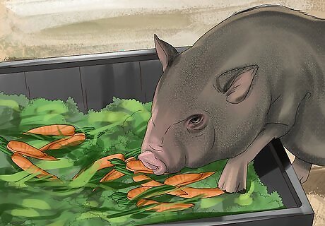 Supplement your pig’s diet with vegetables. While pellets designed specifically for potbellied pigs should make up the bulk of your pig's diet, you can also give your pig a salad-size portion of vegetables every day. Some good vegetables you can give to your pig are: Leafy greens Carrots Cucumbers