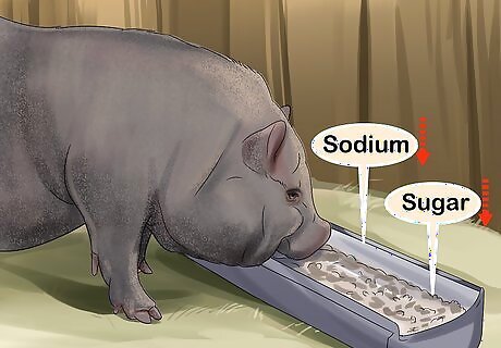 Avoid feeding your pig processed or high-sugar foods. Potbellied pigs don’t do well when their diet is filled with lots of sodium and sugar. Stick with pellets and vegetables when feeding your pig so its diet is balanced and healthy. It’s OK to occasionally give your pig fruit, but keep it to a minimum since fruit tends to be high in sugar.