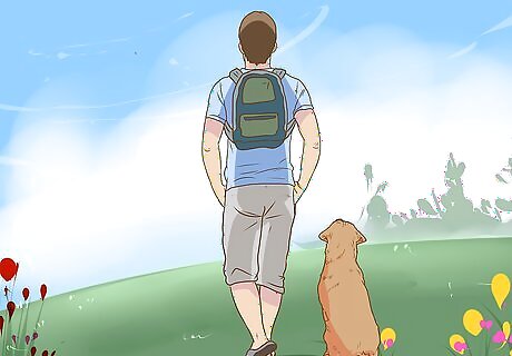 Take in the scenery. Often, when out with your dog, you're likely thinking about what you need to do next week or what's on your work schedule. You're not fully in the moment. Instead, pull yourself out of your head, and take time to actually look at the scenery on your walk. Notice the pretty flowers your neighbor planted. Check out the interesting architecture. Listen to the sounds of the birds and people in the distance. Taking time to be in the moment will make it more interesting, and it will help give you a much-needed break from stress.