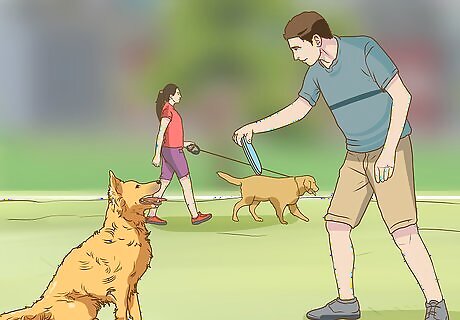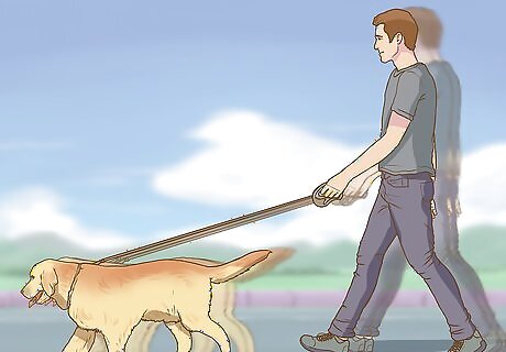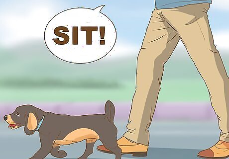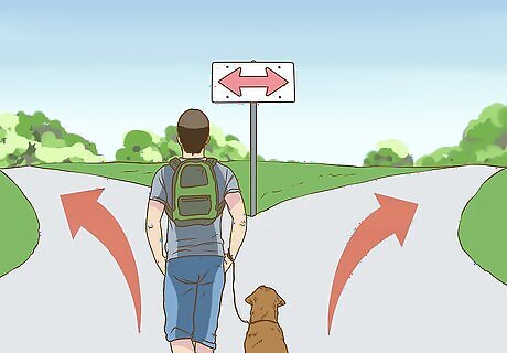 Work on training. Walks generally aren't the place to introduce new commands, but they can be a great way to reinforce training your dog already knows. Plus, your dog will find the walk more interesting if it gets to interact with you more. For instance, you can work on sit and stay as you walk. Try telling the dog to sit at various times throughout the walk, particularly if it's a challenging time, such as your dog wanting to chase after a squirrel. You could also try running a few paces ahead and then asking the dog to sit.