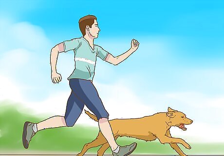 Start running. If just walking bores you, consider running with your dog. Not every dog will be up to it (especially elderly dogs), but if you can get your dog in the habit of running with you, it can be fun for both of you. Plus, your dog will hold you accountable better than any other running partner. Make sure your dog can handle running by consulting your vet.