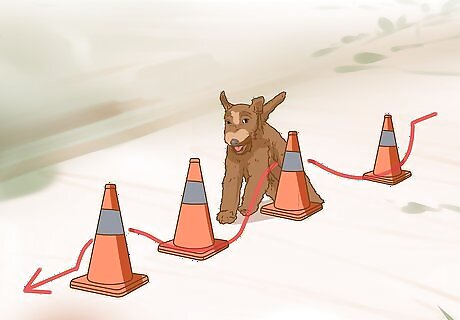 Make an obstacle course. Another way to keep your dog entertained is to treat the walk like an obstacle course. You could weave the dog between parking meters, for instance. You could also ask the dog to jump up and walk on benches or on low garden walls. Basically, you're just looking for ways to make the walk more interesting.