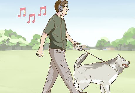 Learn something new. Walking is a great time to listen to an audiobook or podcasts. While you don't want to completely disengage from your dog while walking (after all, your job is make sure your dog is safe), you can keep 1 earbud in to listen to a novel, learn a language, or listen to a podcast about something interesting.