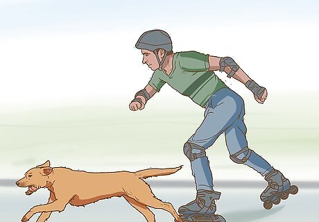 Try rollerblading. Another option to workout with your dog is to rollerblade. You'll be able to go faster, which your dog will enjoy. Plus, you may find it more interesting than just walking, because you'll be more fully engaged in working out. However, your dog needs to be well-trained on a leash if you are going to rollerblade with it.