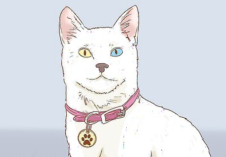 Tag your cat. Your cat should be tagged anyway, in case it gets outside, but tagging is especially important for deaf cats. Buy a collar and tag. On the tag, include your contact information, as well as a note about the cat's deafness. Be sure to attach the tag to a cat-safe collar. These collars are designed to break away if they get caught on something like a tree branch. This helps keep your cat from strangling or becoming seriously injured if they are caught. It's also a good idea to have your cat microchipped, as collars can come off. A microchip is a small chip inserted under your cat's skin that provides your contact information when scanned.