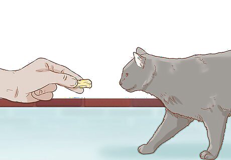 Use a treat and a visual cue to teach your cat to come. Although most cats won't come every time you call them, you still want to teach your cat a visual cue for "come." When your cat is looking at you, hunch down on the floor, and create a hand signal, such as tapping the floor. Use a treat to entice it over. Reinforce this behavior until it gets the idea.