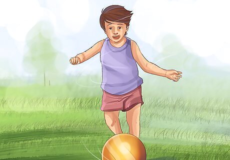 Increase your toddler’s basic motor skills with focused movements. There are a variety of exercises you can do to help your toddler build skills like balance and coordination. Ask your child’s pediatrician or physical therapist for specific recommendations. You might also try simple exercises such as: Standing on one foot. Catching or throwing a ball. Kicking a ball. Hitting an object with the hand or another object (e.g., you might suspend a balloon from the ceiling and have the toddler hit it with their hand or a fly swatter). Hopping, skipping, and marching. Moving deliberately from one designated spot to another (e.g., have the toddler do a “tightrope walk” along a line marked on the floor or ground).