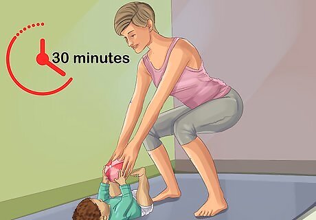 Aim for 30 minutes of structured exercise each day. This is the amount of organized exercise that pediatricians recommend for most children aged 1-3, including kids with chronic illnesses. Talk to your child’s doctor or physical therapist to determine whether this amount of exercise is safe and appropriate for your child. Try to have your toddler exercise at a time of day when they are feeling well-rested and their symptoms are minimal. If your toddler is not up to exercising for 30 minutes at a time, consider breaking it down into shorter periods of exercise throughout the day (e.g., 2 15-minute exercise sessions, or 3 10-minute sessions).
