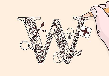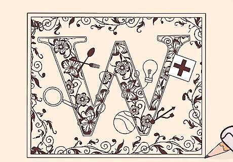 Draw inspiration for your designs. Think of how you can illustrate your story, name, word, or individual letter purely with colors, images, and designs. Use the defining characteristics of a person, setting, or story to decorate your illuminated letter. Try one of many traditional motifs for illuminated letters, which include birds and feathers; fruit and flowers; ribbons, vines, or rope; and Biblical motifs. If the themes of a text or your own interests or personality are more abstract, think of how they can be made into a symbol you can draw. For example, an image of weighted scales often represents justice, and a rose can symbolize romance.