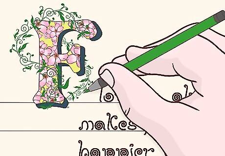 Sketch your designs. Use a pencil to sketch out the images you want to decorate your letter. Draw your designs inside or around letter, or even taking the shape of the letter itself. Keep the drawing balanced with the shape of the letter by drawing a faint box in pencil around the outside of it as a guide for where decorative elements should end. Then erase the box, or build on it to create a decorative border for the letter if you wish. Reach outside and overlap the lines of the letter with your designs to create a full and dynamic illustration. For example, you could decorate the letter “S” with a snake and create the illusion that the snake is coiled around the letter, or even that the snake makes up the letter with its own body.