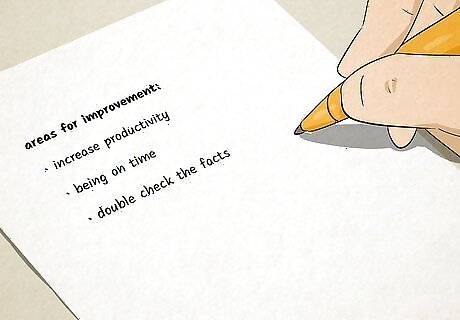 Make a list of your areas for improvement. You will know exactly what you need to do to improve your job performance if you review the feedback from your evaluations. Look for things that you, your coworkers, and supervisor feel that you can do better. Look for keywords in your evaluations like: improve, increase, strengthen, expand, or develop. Look for reoccurring themes in your evaluations like being on time, checking your facts, or being a team player.
