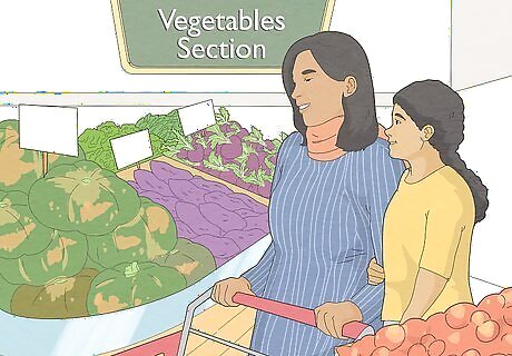 Take your teen to the grocery store. The grocery store is a great place for you to go and get your teen interested in healthy foods and a more nutritious diet. Bring your teen with you to the store to get involved in making some of the choices for the meals and snacks you're going to serve during the week. Ask your teen what they want to eat and have them pick out a few items. Talk to your child about how each meal should have some protein, whole grains, and a fruit or vegetable. You can even ask them to pick out the ingredients for an entire meal. If you typically stock up on some healthy snack foods, ask your teen to pick some of those out as well.