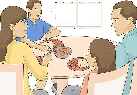 Make time for family meals. Many studies have shown that eating dinner together as a family is incredibly important for your child's overall health. Plan to have as many meals together as you can. Studies have shown that kids who ate dinner together with their family are 35% less likely to engage in disordered eating patterns, 24% more likely to eat more nutritious foods and 12% less likely to be overweight. It can be difficult finding a night to eat dinner together with sports practices, after-school clubs, and homework. The weekends are a great time to review your family's schedule and plan in dinner at a time that will work for everyone. Even if you're forced to grab a bite to eat out at a restaurant, go as a family and sit down instead of eating in the car. The weekends are another great time to eat together. You can do breakfast, lunch or dinner on weekends when everyone is home.