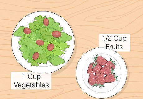 Include one to two servings of fruits or vegetables at every family meal. Other important food groups to include at each meal and snack are fruits and vegetables. This is where your teen may be lacking the most and will benefit from you preparing and serving these foods often. Fruits and vegetables are the biggest sources of vitamins and antioxidants in anyone's diet. They're also a really great source of fiber. Serving a portion of vegetables and fruit with every meal and snack will help you and your teen get in the recommended five servings daily. Measure out 1 cup of vegetables, 2 cups of salad greens or 1/2 cup of fruit per serving.