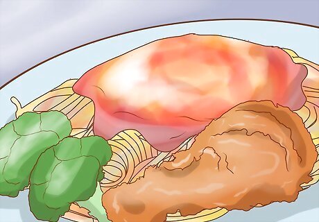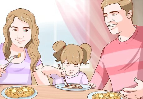Serve the same food to everyone. A good way to promote healthy eating habits is to serve everyone at the table the same foods. Fix a meal for the entire family and expect everyone to eat it. Make healthy, balanced meals that everyone enjoys, including your toddler. During this time, refrain from making too many new dishes or dishes that may not appeal to your toddler, like things with too many spices. If your child isn’t interested in one of the foods, or doesn’t eat much, stay calm and don’t overreact. Don’t force your child to eat the food. Make sure you don’t make the child something else to eat in place of the food on the table. That reinforces bad behavior and teaches your child that refusal results in different food. If you have a picky eater, make sure to have a couple of options that your child likes along with new options. As long as the child is getting a balanced meal (think eating the rainbow), there is no need to fuss. Allow time for your child to adjust to eating these new foods.