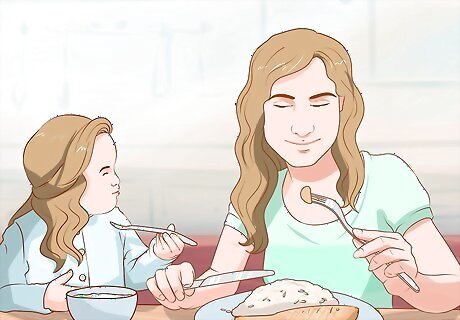 Model good eating habits. Your child learns a lot just by watching you. If you want your child to have good eating habits, model them for your child. When your toddler sees you eating good food, like chicken and vegetables, you will set an example for them to follow. Eating good food with your children helps normalize the idea of healthy eating habits. You also may avoid the idea that kids have to eat vegetables and adults can eat anything. Often parents don't think toddlers will like "grown up food" that may have more spice to it. It's best to allow your child to safely taste food, even if you don't think they will like it. Their taste is developing and the more options, the more refined and open they will be, especially if they initiate a desire to taste.