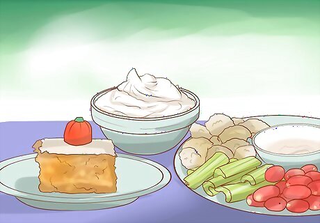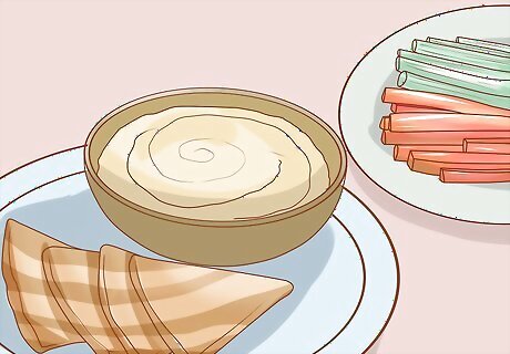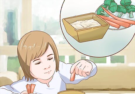 Add healthy dips and sauces. Sometimes, a plain vegetable may not be appealing. Maybe your child likes to touch and play with the food before eating it. Dips and sauces can be helpful in getting your kids to eat vegetables or fruits. Kids love dipping veggies and fruit in sauces, and it adds some additional flavor your child might like. Make sure to offer healthy dipping sauces. Don’t provide dipping sauces with lots of cheese, heavy cream, and fat. Also avoid dipping sauces with too much sugar. You want to supplement the nutrition of the food, not cover it up with fat, sugar, and junk. Try traditional or vegetable hummus, natural applesauce, mustard, or plain yogurt lightly sweetened with honey.