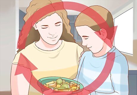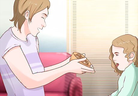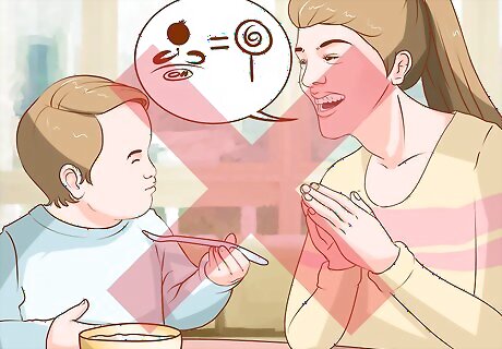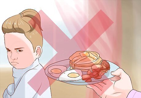 Avoid using food as a reward. Many parents may find that the easiest way to stop their toddler’s outburst is to give them a cookie. This is a bad practice. Using sweets and junk food as a treat can encourage unhealthy eating habits at a young age. Rewarding children for tantrums or whining can reinforce bad behavior, causing the child to think that whining or crying will result in a treat. Providing treats or food when the child is emotional may teach the child to eat emotionally. You should also refrain from using dessert or sweets as a reward for eating vegetables or other foods at dinner. This sets up a pattern of sweets being the best part of the meal, which develops unhealthy eating habits.