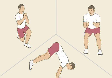 Develop a high-intensity interval training routine. There are many ways to do high-intensity interval training (HIIT). Work with your trainer or coach to choose a routine that works best for you. For example, you might try 4 rounds of the following routine, with 12-second periods of inactivity between each exercise: 35 seconds of drop lunges. 35 seconds of burpee crunches. 35 seconds of plank jack hops. 35 seconds of step to jump squats. 35 seconds of pop jacks. 35 seconds of triceps back presses.