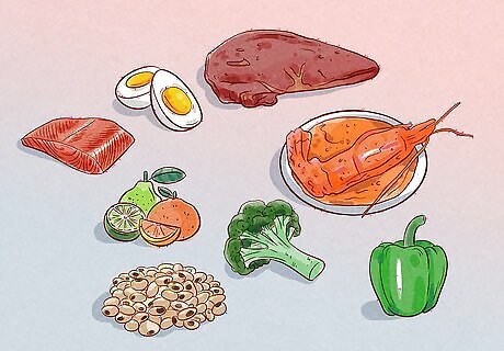 Choose foods rich in vitamins B-12, C, D, and K. In addition to folate, a variety of other vitamins can also support healthy platelet production. During your recovery, eat a balanced diet rich in these vitamins: Vitamin B-12. Good sources include beef and beef liver, eggs, seafood, fortified cereals, and fortified dairy alternatives (such as soy milk). Vitamin C. You can get this vitamin from citrus fruits, cruciferous vegetables (such as broccoli and brussels sprouts), bell peppers, and strawberries. Vitamin D. A few dietary sources include egg yolks, fatty fish (such as salmon and mackerel), fortified dairy products, and fortified breakfast cereals. Vitamin K. This vitamin occurs in leafy green vegetables (such as spinach and kale), broccoli, soybeans and soybean oil, and pumpkin.