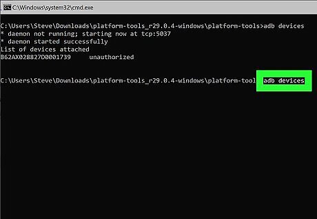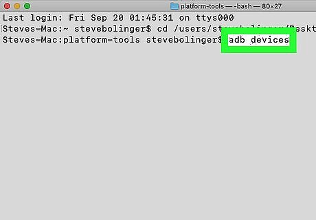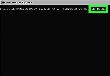 Type adb devices again and press ↵ Enter. When you do this again, you'll see your Android's serial number appear in the window.