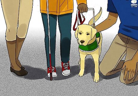 Bear in mind that people who are blind who use guide dogs and/or white canes treat them as extensions of their bodies. Never distract guide dogs from their job or touch, move, or grab a cane without the owner's permission. Imagine if someone moved your keys once you've established a location in which you can readily and quickly retrieve them. That'd slow you down. Plus, it's personal property. The keys allow the sighted person to drive a car which is a mobility tool and the white cane allows the blind individual to travel effectively, independently and safely which also acts as a mobility tool. Guide dogs that may be present are not super animals, they can be distracted by cooing, talking, whistling, food, and other animals. Distracting a guide dog can cause a someone who is blind to lose their life. It is the dog's responsibility to ensure the next step they take is safe. They cannot do this if they are looking at you.