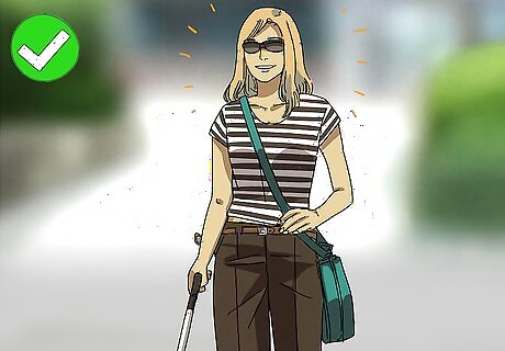 Remember that not everyone who is considered 'blind' are 100% blind. Some people who are legally blind have limited vision, others can see some in different light levels such as dusk or cloudy light, and yet others may have pinhole vision or peripheral vision. Never touch or grab someone in efforts to assist. Never place an item in their pockets or grab an item of theirs in efforts to assist. They may not be able to see, but most are still physically able.
