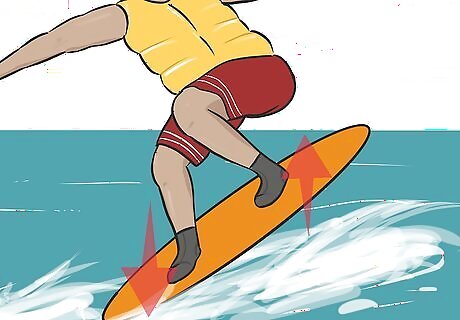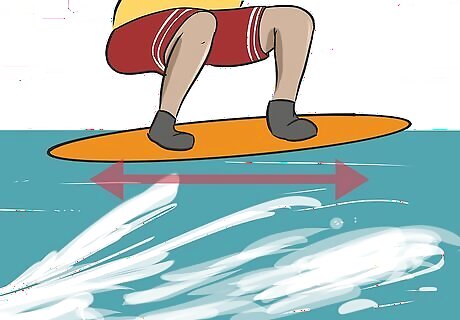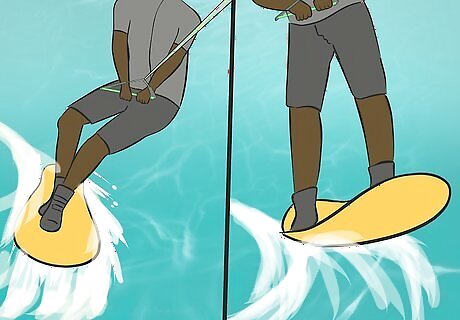 Raise your back leg to stabilize the board while you’re in the air. You have successfully launched yourself into the air. Now, all you have to do is keep your cool to land safely! Shift your weight to your front foot so the back end of the board rises. Then, level out the board when you reach the peak of your jump, which is when you feel the board stop rising and begin heading back toward the water. When you’re preparing for the landing, your best bet is to keep the back end of the board a little lower than the front end. It helps you avoid a wipeout. Instead of leveling out the board completely, focus on staying balanced. You may feel tempted to stand up at first. It’s an easy mistake to make when you’re in the rush of a successful trick, but try to stay calm and move quickly. Keep your feet planted on the board and maintain your momentum from the push-off you did to lift off of the water.