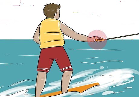 Turn your board to move as far away from the wake as possible. Trail behind the boat until you establish your balance and gain momentum. When you’re ready to jump, steer the wakeboard toward either side of the boat. The travels all the way past the boat, although the exact distance depends on the length of your rope. The side you choose doesn’t matter, so go wherever you feel most comfortable navigating. Balancing and steering are some of the basic techniques you practice when you first learn to wakeboard. Balance as you move by standing with your dominant leg forward, your knees bent, and your hands on the rope. To steer the wakeboard, pull the rope away from the boat. The board moves in the direction you pull the rope. You don’t need to move your legs at all to steer.
