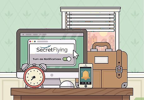 Set an email or mobile alert to get notified when the price drops. Click the email notification option on your computer or the “notify me” button on your phone. The flight tracking app or website will automatically email, text, or notify you when a price is set that appears to be outside the norm for that date or time. The more dedicated you are to finding a cheap price, the more notifications you’ll get. Be prepared to handle all of the emails and notifications!