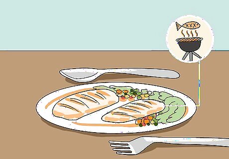 Eat non-fried fish at least twice a week. Fish high in Omega-3 fatty acids, such as salmon, lake trout, mackerel, and herring, are incredibly good for your heart. Make sure you grill, pan-sear, bake, or broil your fish rather than frying it. You can also mix fish into other dishes. For example, you could mix salmon or tuna into whole-grain pasta and finish with a fresh pesto or light sauce. However, avoid heavy, cream-based sauces, which have more saturated fat.